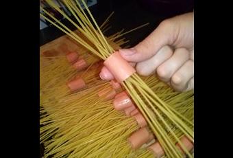 Couper les knackis en petits morceaux, d’environ 2 cm. Prendre un spaghetti, le traverser de part en part. Répétez cette opération une dizaine de fois dans le morceau de saucisse. Puis passer à un autre morceau de saucisse, jusqu’à faire la quantité de pâtes que vous voulez faire.