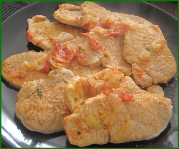 Faire revenir l'oignon émincé dans 2 càs d'huile d'olive avec les escalopes de porc. Ajouter ensuite, l'ail écrasé, les tomates pelées, le vin blanc, les feuilles de laurier et le paprika. Saler, poivrer et ajouter du piment suivant les goûts.