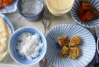 Tout a commencé par un petit flacon d'épices... J'avais acquis il y a quelque temps deux mélanges épicés concoctés par le chef Olivier Roellinger et Beena Paradin, actrice multi-facettes de la cuisine indienne à Paris. L'un, un garam masala, s'invitait régulièrement dans ma cuisine. Mais l'autre, un mélange tandoori, attendait patiemment que je daigne m'intéresser à lui. Il y a quelques jours, je me suis dit que cela ne pouvait plus durer et j'étais impatiente de préparer un poulet tandoori. Il se trouve que dimanche midi, créneau souvent occupé par Monsieur, c'était à mon tour de passer en cuisine. La concordance de ces deux données a fait naître l'idée d'un brunch indien (qui a ressemblé en fait davantage à un déjeuner). De plus, cela s'était-il imprimé dans mon inconscient ou pur hasard, je découvre que l'émission On va déguster de France Inter était justement consacrée le même jour à la cuisine indienne et que, parmi les invités, il y a justement Beena Paradin.