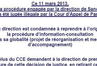 Ils ont donc réussi à faire plier un patronat peu respectueux de leurs droits… et plus soucieux de satisfaire ses actionnaires que ses salariés. La direction de Sanofi vient donc d’être condamnée à revoir son plan de réorganisation… Voici le L’arrêt de la Cour d’appel de Paris en PDF, et le tract distribué sur les sites concernés par le plan de licenciements :