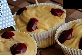 Une fois les cupcakes cuit et refroidit prélever une petite partie du centre du cupcake et le remplir de coulis de framboise .Dresser le topping et réserver au frais .