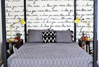 J’ai déniché une superbe idée pour donner du style à une petite chambre : écrire à la main une même phrase sur tout un pan de mur !