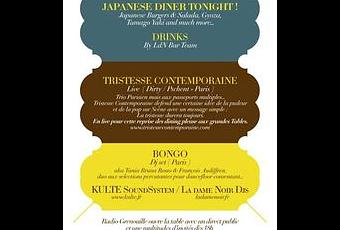 Côté ventres affamés (pour tenir le rythme sur la piste) la cuisine de la Dame Noir vous réserve une carte terriblement japonisante : Japanese Burgers de poulet Saumon et Espadon , Japanese Fried Chicken & Sweet Chilly , Gyozas & Salades japonaises et les desserts special de Tania Bruna Rosso .... Happy Drinks pour tous les gosiers, cocktails de Mojtos Menthe et Framboise , Muscat (Raisin frais&vodka) en tête.