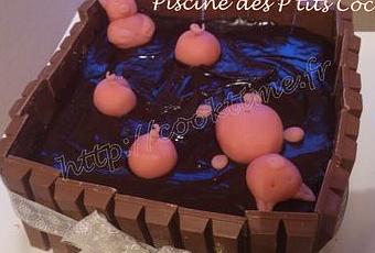 Puis laisser prendre le temps de faire le bavarois mangue ( 2 mangue ,50g de sucre, 30cl de creme liquide, 2 feuilles de gélatine ) montez la chantilly ,mixer les 2 mangues et en laisser quelques morceaux pour incorporer ensuite dans l'appareil, mettre dans une casserole avec le sucre chauffer, mettre les feuilles de gélatine a ramollir dans l'eau froide les égouter et les mélanger dans le coulis de mangue une fois le coulis tiède incorporer délicatement la chantilly , puis ajouter les morceaux de mangue restant. Déposer cet appareil sur la base crepes/ Chocolat. Le lendemain, faire une ganache et napper le bavarois. Lorsque le tout est bien pris, mettre des kit kat ® pour garnir le tour du bavarois. Deposer des petits cochons qui auront été faconné en pate d'amandes.