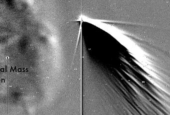 Stereo B (Stereo Behind) – l’un des deux membres de la paire de satellite d’observation solaire capable d’étudier la face du Soleil opposée à la Terre – a capturé une série d’images de la comète, quelques jours après sa visite au corps le plus massif du système solaire (99,5 % de la masse totale). Une violente bourasque de particules solaires, éjection de masse coronale (CME), parcourt l’espace tandis que la comète se promène, abandonnant dans son sillage des milliards de grains de poussières. On distingue également la Terre, éloignée de plusieurs dizaines de millions de km. En dépit d’un noyau dont la taille est estimée à 1 km, PanSTARRS brille à en éblouir la caméra qui enregistre les images. Sa longue chevelure apparait complexe et plutôt mal peignée …, fendue à plusieurs reprises. Peut-être est-ce l’oeuvre d’une rotation rapide de cette boule de glace ?