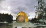 Posé sur une surface de l'Etang Long nous dit l'auteur de l'article François Valle, l’Auditorium se présentera sous la forme de deux coquilles qui se font face, la plus grande (30 mètres de haut) étant destinée à accueillir le public (400 personnes) et la plus petite (20 mètres de haut) étant consacrée à la scène. Entre les deux, un espace dont la largeur pourra varier en fonction des spectacles (grâce à un mécanisme technique assez simple), un espace qui sera normalement recouvert d’une pellicule d’eau (20 centimètres environ), mais qui pourra aussi, au besoin, être asséché provisoirement pour accueillir des spectateurs supplémentaires. La magie du lieu naîtra de ces jeux de perspectives et de lumières, de ces courbes et de ces arcs qui ne cesseront de se répondre.