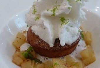 En dessert : Mirliton au rhum d’Arcane, ananas rôti au caramel de cardamome (explosion de saveurs, en version touche sucrée)