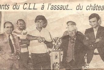 Un atelier était chargé de faire un château fort en pain d'épice qui , une fois fini , pesait pas moins de 30 kilos !!.Lorsqu'il fut terminé , chacun l'admira car il était magnifique. Une petite fête fut organisée, des personnalités furent invitées dont Maurice Michel , maire , ainsi que les parents des petits bâtisseurs.Le président du Club Léo Lagrange était M. Marcel Faure (photo 1- chemise blanche, belle chevelure brune et sourire sympa), également directeur de l'école, il donna le feu vert pour ...l'attaque du château fort. Les fortifications furent bien vite mises à mal. Tout fut englouti en moins de deux !!