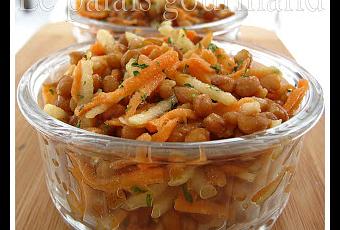 Porter à ébullition, couvrir et cuire pendant 30 minutes. Égoutter les lentilles et rincer de nouveau à l'eau froide. Fouetter tous les ingrédients de la vinaigrette. Dans un bol, mettre les lentilles, la carotte, la pommes, l'échalote, le persil et la vinaigrette. Bien mélanger et servir frais. Au besoin, ajouter un peu de sucre à la salade.