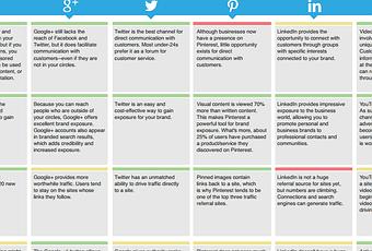 Si la version 2013 est moins riche que la version 2012 que je vous avais présentée l’année dernière, elle se dote d’une version interactive plus réussie graphiquement. En ce qui me concerne, je regrette le choix de se focaliser sur 6 médias sociaux (Google+, Twitter, Facebook, TouTube, LinkedIn et Pinterest). La version précédente était peut-être trop large, mais celle-ci tombe dans l’excès inverse. Instagram ou SlideShare devraient avoir leur place.
