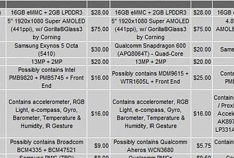 Sans surprise, l'écran représente le plus gros poste de dépense, puisqu'il coûte à lui seul 75 dollars suivi par l'Exynos Octa à 30 dollars. La Snapdragon 600 coûte un peu moins cher puisqu'elle n'est facturée que 20 dollars, mais la version européenne ne coûte que trois dollars moins à cause d'autres composants aux tarifs plus élevés. Le détail est disponible dans l'image ci-dessus.