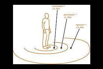 Dans les années soixante, l’anthropologue américain Edward T. Hall avait jeté les fondements d’une discipline qu’il a baptisée proxemics (proxémie ou proxémique, en français, selon les traductions). Il montrait de façon très convaincante que les diverses cultures ne donnaient pas la même envergure à la sphère physique privée qu’il fallait respecter pour interagir convenablement avec quelqu’un. Dans une queue par exemple, les Latins se serrent plus volontiers les uns contre les autres que les Anglo-saxons et il n’est généralement pas très bien vu dans la plupart des cultures, même la latine, de s’adresser à quelqu’un en lui parlant de trop près, dans le nez, en quelque sorte. Les distances déterminent le degré d’agressivité, de neutralité ou de bienveillance que l’on attribue spontanément à l’interaction.