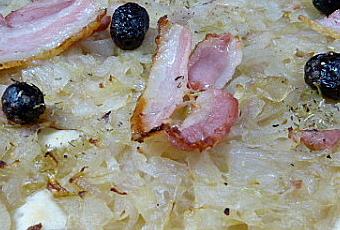 Préparation : Eplucher et émincer finement les oignons. Les faire fondre avec l'huile d'olive (départ à froid) en mélangeant sans arrêt. Quand ils obtiennent une coloration beige les saupoudrer de sucre et laisser fondre 2 ou 3 mn. Saler et poivrer, Ajouter quelques morceaux de poitrine fumée taillée finement en lardons. Saupoudrer d'herbes de Provence. Réserver.