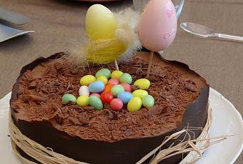 Préparez la garniture: Faire tremper la gélatine dans l'eau froide. Fouettez les jaunes, le sucre, la Maïzena, et un peu de lait. Portez le reste de lait à ébullition . Incorporez le mélange précédent au lait bouillant puis remettre sur le feu et faire épaissir à feu doux. Incorporez la gélatine hors du feu. Quand elle est dissoute, ajoutez le chocolat. Lissez le mélange puis laissez refroidir. Fouettez la crème liquide puis incorporez-la au mélange. Étalez cette préparation sur le gâteau. Placez au réfrigérateur, au bout de 2h ôtez la bande de papier sulfurisé. Décorez le gâteau de copeaux de chocolat et déposez des œufs au milieu du "nid"