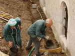 Samedi matin, les plus courageux se sont préparés bon pied bon œil pour aller nettoyer les abords de l'église de Bellecombe. Il n'existait pas d'écoulement pour les eaux pluviales, d'où un ravinement du terrain tout autour de l'église. Les travaux ont débuté de bonne heure par un déblaiement de tous les branchages etc. et la préparation d'une future évacuation totalement aménagée.