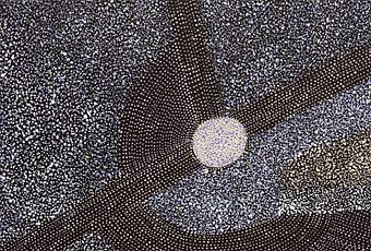 La peinture d'Abie Loy Kemarre n'est qu'une immense vibration. À la fois macrocosmique tel ce premier détail du Rêve de la poule du Bush où l'on se plait à imaginer un tourbillon de galaxies au sein de l'univers interstellaire, et à la fois microcosmique dans le bruissement des feuilles de ces plantes que le vent soulève.