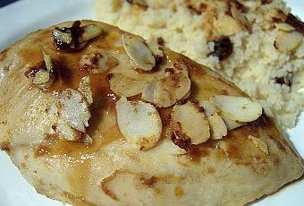 Pour 2 personnes : 2 blancs de poulet, 1/2 cc de cumin, 1/2cc de paprika doux, 1/2cc de coriandre, 1 noix de beurre, 1 verre de bouillon de volaille, sel, poivre, 2cs d'amandes effilées, Accompagnement : semoule, 1cs de raisins secs, 1 pincée de paprika et de cumin- Faire fondre le beurre dans une poêle puis ajouter les épices et faire chauffer 2 min en remuant.