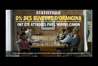 La marque a fait appel une nouvelle fois à l’agence Fred&Farid . Dans le spot « Orangina et l’homme canon », un homme vole tel un canon puis se « crash » dans un mur, pendant que le patron crie sur ses employés . On y voit après le slogan « Statistique : 0% des buveurs d’Orangina ont été attaqués par l’homme-canon » . Pour « Restez vivants ! buvez Orangina ». Dans le spot « Orangina et l’homme malade », un pigeon « se soulage » pendant qu’une fille s’engueule au téléphone . Comment trouvez-vous les spots ?