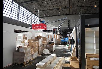 8 heures 30. Tous les corps de métier se retrouvent dans ce grand décor éphémère. Les menuisiers ajustent les derniers éléments dans une bonne odeur de poussière, de colle et de bois. La peinture n'est pas sèche que les électriciens installent les luminaires sur les stands.