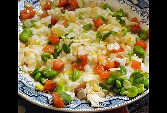 Et ce jour-là, aujourd'hui, je me dis alors ayé c'est l'printemps !!! Si j'avais de la pelouse dans mon jardin à la place de l'herbe galeuse qui le couvre j'imagine même que j'aurais du plaisir à me rouler dedans… Enfin avant que l'urbain que je suis ne se souvienne du nombre considérable de bestioles en tout genre avec plein de pattes qui crèchent par là !Et puis je rentre à la maison après avoir pris un p'tit coup de soleil parce qu'il ne faut pas abuser de ces choses-là au début et je me mets ma cuisine en mode printemps !Et aujourd'hui pour passer au printemps je me suis dit qu'un p'tit risotto printanier c'était bien de saison…P'tit risotto printanier Ingrédients : 200g de riz pour risotto –75cl de bouillon de volaille – 10cl de vin blanc sec - 50g de parmesan râpé fraîchement - 2càs d'amandes effilées – 1belle poignée de fèves fraiches écossées – 50g de filet de saumon fumé - 1càs d'huile d'olive - 1càs de beurre - sel et poivre – des feuilles de menthe Faites rapidement cuire les fèves dans une casserole remplie d'eau salée. Attention les fèves passent vite du pas cuit au trop cuit. Egouttez-les bien ensuite.