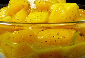 Les ingrédients : 1 mangue mûre à point, 1 gousse de vanille, 5 cl de rhum, fromage blanc, 1 bland d'oeuf, meringues aux noisettes, sucre glace, beurre 1/2 sel.