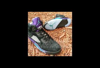 Ces Air Jordan 5 Black Grape sont inspirées des Air Jordan V Grape OG (qui seront rééditées le 4 avril 2013) mais avec un dessus en daim noir, contrasté par des accents de violet et de turquoise.