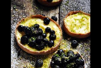 homogène. Faites chauffer le lait et le beurre dans une casserole puis versez en filet sur le mélange précédent en remuant sans arrêt.Remettez le tout dans la casserole puis faites chauffer sans arrêter de remuer jusqu'à ce que la crème épaississe. Ajoutez le beurre coupé en petits morceaux et fouettez le tout vivement. Réservez la crème au frais le temps de faire les fonds, pour cela il vaut mieux utiliser des cercles mais des moules feront aussi l'affaire.Découpez la pâte en petites boules de la taille d'une noix étalez-la le plus finement possible, plus elle sera fine, plus les tartelettes seront bonnes… Etalez la pâte sur du papier sulfurisé cela sera ainsi plus facile de les retourner dans les cercles.Posez les cercles sur une plaque couverte de papier sulfurisé, foncez les moules avec la pâte, attention elle est très fragile. Découpez la pâte qui dépasse, remplissez les moules avec des haricots ou des billes de cuisson et enfournez ensuite pendant 15 minutes à 150°. Quand les fonds sont cuits laissez-les un peu refroidir, enlevez la garniture, démoulez-les puis laissez-les complètement refroidir sur une grille.Il n'y a plus qu'à garnir les tartelettes de crème, de myrtilles, de zeste de citron vert et de sucre glace et si éventuellement vous avez quelques pistaches hachées très fins… Après, mangez-les en espérant que la boulangerie soit fermée…