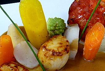 Il est composé de délicieuses noix de St Jacques juste snackées en dernière minute, de légumes anciens, d'une tranche de chorizo pour le piquant, et du délicieux jus de viande (jus des joues de porc au cidre) filtré et réduit.