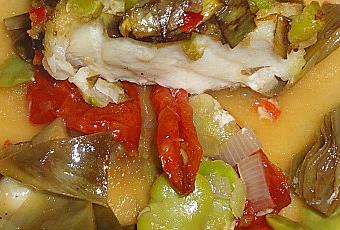 4 filets de cabillaud Finitions :1 œuf battu-1 c.s. de farine-0,5 dl d’huile d’olive-Sel, poivre du moulinBrunoise2 artichauts-50 g de poivrons rouges-200 g de petites fèves en cosses-50 g d’olives -10 g de panure2 c.s. d’huile d’olive-1 c.c de thym frais effeuillé-Sel, poivre du moulin