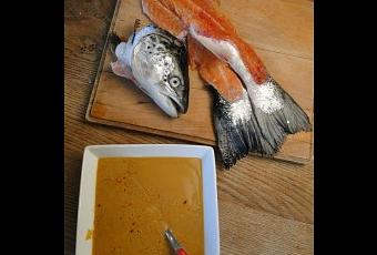 Si si, je n’ai utilisé que des chutes : j’ai levé les filets d’un saumon et j’ai pris : l’arête, la tête tous les déchets. Et le résultat est étonnant!