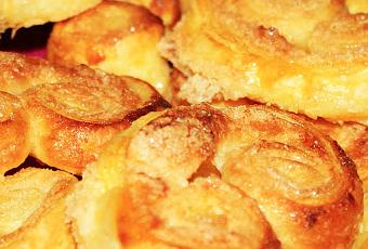 Roulez chaque côté de la pâte vers le centrepuis coupez des tranches de 0,5-1cmpuis rebadigeonnez d'oeuf et saupoudrez à nouveau de sucre