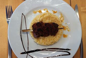 Avant le week end pâsqual, entre collègues de travail, direction un cours de cuisine à l'heure du déjeuner. Cuisine Aptitude proposait un menu pour préparer les fêtes de Pâques et c'est donc plein de bonne humeur que nous sommes arrivés à la cuisine, Quai des Bateliers. Accueillis chaleureusement, nous nous sommes tout de suite installés autour du plan de travail, avons enfilés notre tablier et avons écoutés les instructions du Chef. Au menu : une brochette de gigot d'agneau gratiné au chorizo et ses pépinettes comme un risotto. (A savoir des minis pâtes cuites à la façon risotto) Couper, ciseler, mixer, faire revenir, griller, remuer. En vrais petits chefs, nous avons sagement exécuté la recette. A peine plus d'une demie heure plus tard, l'assiette était prête et dressée. Et c'est à l'étage, autour d'une grande table d'hôtes que nous avons dégusté notre préparation. Un véritable régal. Une douceur sucrée nous a même été offerte par le Chef pour terminer le repas sur une note sucrée (verrine de fruits au sirop sur une mousse de noisette et chocolat, accompagnée de sa madeleine aux noisettes). Je vous laisse découvrir la recette et surrtout n'hésitez pas à la tester pour les fêtes de Pâques. Une préparation très simple pour un maximum d'effet dans l'assiette ! Ingrédients (Pour 4 personnes) : Pour la brochette : - 600 grammes de filet de gigot d'agneau- 150 grammes de chorizo- 50 grammes de tomates confites- une gousse d'ail- 50 grammes de pignons de pin- 50 grammes de parmesan frais- 3 cuillères à soupe de basilic ciselé - 5 cl d'huile d'olive Pour le risotto : - 200 grammes de pépinettes (ou de riz à risotto pour la version plus classique)- 10 cl de vin blanc- 1 échalotte- 40 grammes de parmesan râpé frais- 2 cuillères à soupe de crème fraîche épaisse- 1,5 litre de bouillon de volaille- 2 cuillères à soupe d'huile d'olive Préchauffer le four à 180° (thermostat 6). Oter la peau du chorizo et le taille en cube. Mettre dans un bol mixer les cubes de chorizo, les tomates confites, l'ail, le parmesan et les pignons de pin. Mixer le tout et rajouter l'huile d'olive. Assaisonner selon vos goûts. Rajouter le basilic. Tailler les filets d'agneau en 12 noisettes et les piquer sur des pics à brochettes. Cuire dans une poêle chaude les brochettes d'agneau à l'huile, assaisonnées de sel et de poivre, 2 minutes sur chaque face. Etaler la croûter de chorizo sur les brochettes et terminer la cuisson 5 à 8 minutes au four (selon la cuisson souhaitée). Pour le risotto, Faire bouillir le bouillon de volaille et le garder au chaud pour mouiller le risotto. Faire revenir les échalottes dans l'huile d'olive, puis rajouter les pépinettes. Faire revenir à feu doux jusqu'à ce que les pépinettes deviennent translucides. Ajouter le vin blanc et laisser évaporer à feu vif. Lorsque les pépinettes ont absorbé tout le vin, mouiller avec un peu de bouillon et ainsi de suite jusqu'à ce que les pâtes soient cuites (environ 15 - 20 minutes). Hors du feu, rajouter le parmesan, la crème et assaisonner. Dresser dans des assiettes creuses le risotto et déposer sur le dessus la brochette.