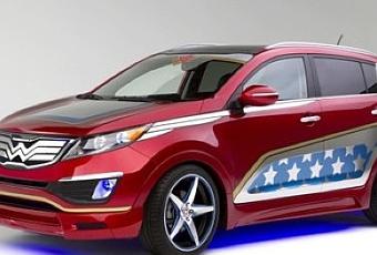 Le design extérieur rouge et bleu, agrémenté d’étoiles, est dérivé directement du costume de Wonder Woman, tandis que le ruban doré enroulé autour du véhicule représente l’arme de choix de l’héroïne, « Le Lasso de Vérité. » À l’avant, l’emblème de Wonder Woman, un aigle sur sa poitrine a été intégré de manière créative sur la grille et est encadré par les faisceaux des phares bleus, qui reflètent ses yeux bleus perçants. Le pare-brise dispose d’une bannière représentant la tiare de Wonder Woman, et les panneaux latéraux chromés sur le véhicule sont des interprétations graphiques de son jet invisible. En dessous, la jante à 5 branches a été choisie pour correspondre à la belle étoile sur l’extérieur du véhicule.