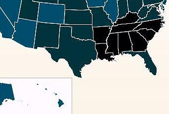 États où les républicains ont votés pour le candidat de la droite chrétienne, Rick Santorum, dans les primaires républicaines de 2012 :