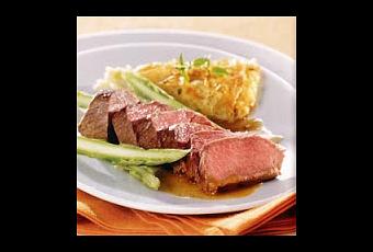 - Éplucher et hacher les gousses d'ail, les faire revenir rapidement dans la poêle. Mouiller avec le fond de veau et laisser réduire un peu. Ajouter le beurre froid restant et remuer jusqu'à obtention d'une crème onctueuse. Servir la sauce avec les asperges et les filets d'agneau. Accompagner de rösti.