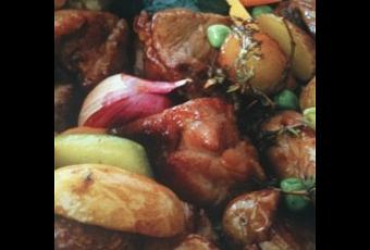 Quand il chante, déposer les pommes de terre, l’ail rose, le thym, le laurier