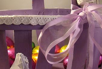 Rien de bien compliqué pour faire ce panier, j'ai farfouillé dans mes boîtes. Je l'ai peint en violet et agrémenté d'un ruban blanc (collé avec du scotch double face). Puis je l'ai décoré avec un ruban violet simplement noué et des fleurs en papier sur la anse.