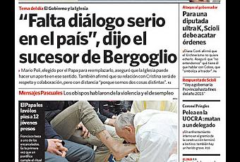 Autre signe qui nous montre que ces journaux récupèrent une vision que leurs engagements idéologiques divergents avaient réduite à une quasi-cécité : Página/12, si hostile à la conduite pastorale de Monseigneur Bergoglio (dont il ignorait tout), reproduit ce matin, sans les accompagner d'aucune observation acide, les propos mesurés du futur archevêque de Buenos Aires, Monseigneur Mario Poli, sur le cadre relationnel dans lequel il compte inscrire son nouveau ministère vis-à-vis du monde politique. Comme son prédécesseur : il appelle les Argentins au dialogue.