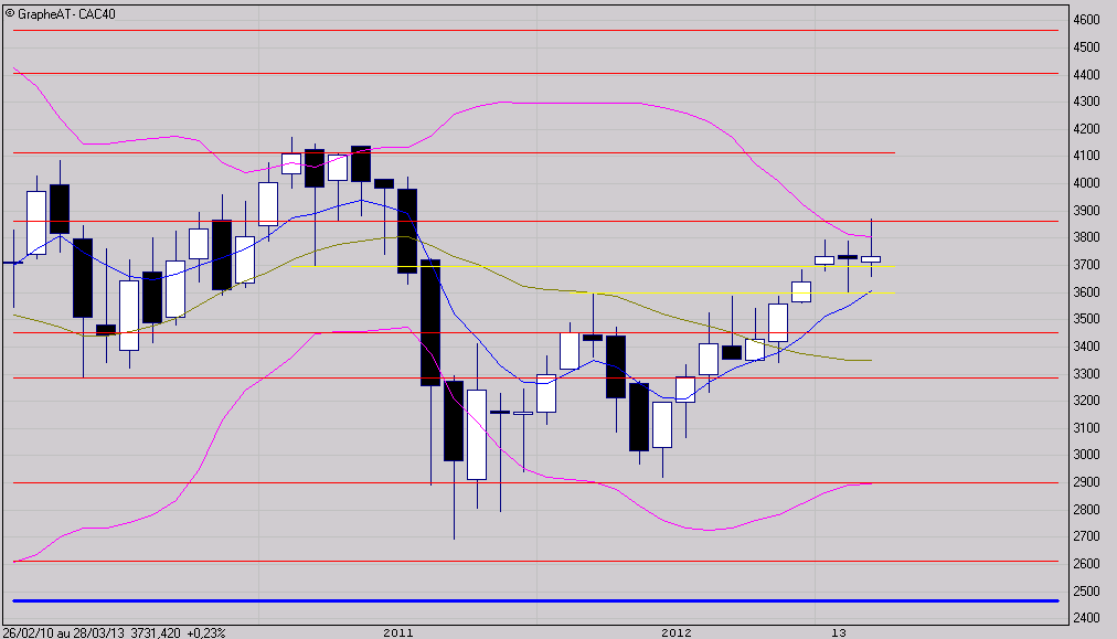 Le graphique des bougies mensuelles, avec ses 2 doji, montre très bien l'hésitation de notre marché entre le support des 3600 points et la résistance des 3865 points.