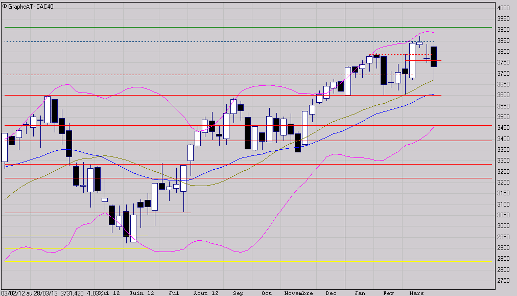 Comme je l'évoquais dans ma dernière analyse hebdomadaire, il fallait s'attendre à un repli plus marqué vers les 3700 points. Cela s'est bien produit cette semaine avec l'aide de l'actualité chypriote.