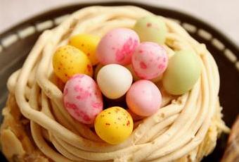 Un nid de Pâques quand on y regarde de plus près (eh oui, j'ai mis la tête dedans pour bien l'étudier!!!) ce n'est en fait qu'un biscuit roulé avec .......une crème au beurre.