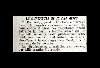 Dans l'article Amour et vitriol, je vous relate un drame au vitriol qui s'est déroulé le 7 juillet 1916 au 28 rue Affre. Marie Auber a jeté un bol de vitriol sur le visage de son mari, Gabriel, alors endormi. L'époux vitriolé est mort à l’hôpital Lariboisière après 22 heures de souffrances. Les différents journaux qui parlent de cette affaire évoquent la jalousie de Marie Auber comme motif de son crime.