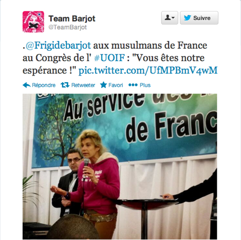 Au début, j'ai cru à un poisson d'avril avancé pour cause de week-end pascal. Mais le doute n'est plus permis : « Frigide Barjot » a bien participé au Congrès de l'Union des organisations islamiques de France (UOIF), la section française des Frères musulmans (et à ce titre l'homologue du Hamas).En voyant la photo ci-contre, j'ai pensé à un montage : qu'elle porte, à 50 ans révolus, un sweat à capuche rose fluo et un futal moulant de pré-ado, pas étonnant venant d'elle, mais qu'elle s'affiche aux côtés des barbus ? Et pourtant, la « catho-déjantée » est bien allée au Bourget déclarer aux musulmans de France qu'ils sont « notre espérance », « nous » désignant apparemment les opposants français au « mariage » gay. Elle récidivait ainsi par rapport à ses déclarations sur la « France black-blanc-beur » qui, prétendait-elle en dépit de la réalité, l'avait suivie, elle.Les vrais destinataires de ce messageQue les participants à la « Manif pour Tous » fussent dans leur immense majorité des Français de souche, catholiques ou non, n'a pas grande importance : « Frigide Barjot » ne s'adressait pas aux musulmans, qui ne partageront jamais son « engagement », mais aux catholiques qui ont peur de l'accusation de « racisme » que leur lance la gauche, qui sait quel mot magique prononcer pour faire perdre ses moyens à la droite. Aussi contre-intuitif que cela soit, il ne faut pas oublier que c'est le même procédé qu'ont utilisé aux États-Unis les leaders du Tea Party pour rassurer leurs sympathisants, presque tous Blancs et chrétiens, et qui avaient peur de passer pour « racistes ». Dès qu'ils le pouvaient, ils mettaient un Noir en avant, ne se rendant pas compte que, ce faisant, ils paraissaient condescendants et étaient justement dénoncés à ce titre. Je n'ai pas encore vu de réaction politico-médiatique à la sortie de la catho-festiviste, mais il est certain que ses propos ne modifieront pas l'opinion d'un Yann Galut. La gauche aura beau jeu d'y déceler de l'hypocrisie alors que c'est, hélas, très sincère.Les propos de « Frigide Barjot » m'ont immédiatement rappelé ceux de Glenn Beck, présentateur à l'époque d'un talk-show sur Fox News, qui avait enjoint la foule rassemblée à Washington fin août 2010 à « aller à leur église, leur synagogue, leur mosquée », alors que les fidèles des deux derniers lieux de culte sont notoirement hostiles au Parti républicain pour lequel Glenn Beck et Sarah Palin faisaient campagne.Le résultat électoral a été désastreux : à l'exception des politiciens déjà connus qui s'étaient affiliés au Tea Party, les candidats issus de la société civile ont été balayés aux élections de mi-mandat de novembre 2010, remportées par le Parti républicain. Une fois les élections terminées, le Tea Party n'a cessé de décliner, au point de ne plus peser grand-chose lors de la nomination du candidat républicain; finalement, c'est Mitt Romney, un mormon social-démocrate, qui a été choisi, et ce sans le moindre suspense.
