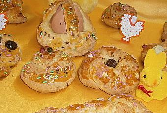 Donner une forme à vos gâteaux (petite couronne, tresse, poupée avec l'oeuf dessus croisé par de la pâte, cheval, oeuf de pâques ect) enduire les gâteaux. Enfourner pour 25mn four 180°.
