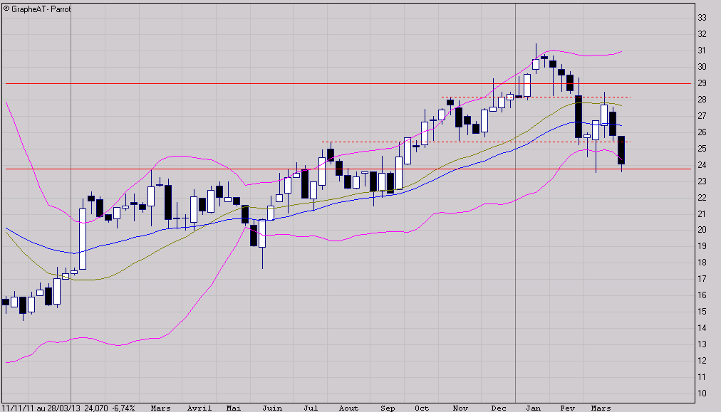 Le rebond de Parrot sur son support des 23,80€ n'aura pas suffi à relancer le titre. Le support des 25,40€ a été de nouveau percé cette semaine et celui des 23,80€ a été affaibli par une bougie noire cette fois (contrairement) à la bougie de la 1ère semaine de mars. La probabilité de retrouver la valeur dans la zone des 18 à 20€ est élevée. Sous les 23,80€ la valeur entrait dans une tendance long terme baissière.