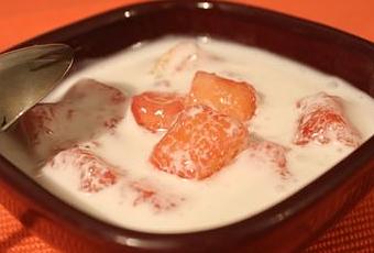 - Mélanger le lait de coco et les billes de pommes gluantes. Servir bien frais.