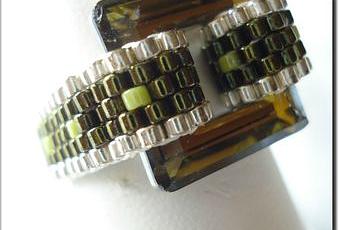 Bague réalisée avec un carre évidé Swarovski de 14/14 mm couleur crystal tabac et le tour de doigt en délicas de Miyuki dans les couleurs argenté et vert kaki