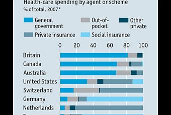 Aux États-Unis, les assurances primaires ne sont pas obligatoires et sont offertes par des assureurs privés (63%) et font souvent partie des avantage sociaux des employeurs (58%). Les pauvres peuvent obtenir l’assurance de Medicaid, alors que Medicare s’occupe des personnes âgées de 65 ans et plus. Environ 16% de la population n’a pas d’assurance-maladie et environ 20% d’entre eux ont des revenus supérieurs à $75,000, et pourraient donc se permettre une assurance-maladie. Le système américain est un leader en terme de technologie et d’innovation médicale, mais sous-performe les autres pays riches sur plusieurs indicateurs tels que la longévité et la mortalité infantile, malgré le fait que les dépenses en santé y soient les plus élevées. C’est l’un des pays où les dépenses privées représentent la plus grande proportion des dépenses en santé.