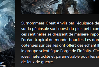 Surnommées Great Anvils par l’équipage de l’UNSC, déployées sur la péninsule sud-ouest du plus petit continent de Requiem, ces sentinelles se dressent de manière imposante au-dessus de l’océan tropical du monde-bouclier. Les données géologiques obtenues sur ces îles ont offert des échantillons incroyables pour le groupe scientifique Forge de l’Infinity. C’est aussi un terrain idéal, hétéroclite et paramétrable pour les simulations de combat de Jeux de guerre.