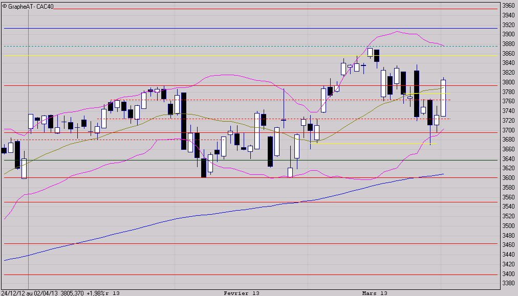 Ensuite, nous rejoignons pratiquement le niveau des bougies noires qui ont contrarié dernièrement la progression du CAC au-dessus des 3795 points.